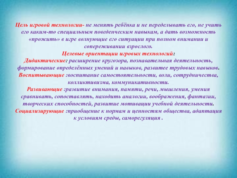 Слайд 20Цель игровой технологии- не менять ребёнка и не переделывать его, не