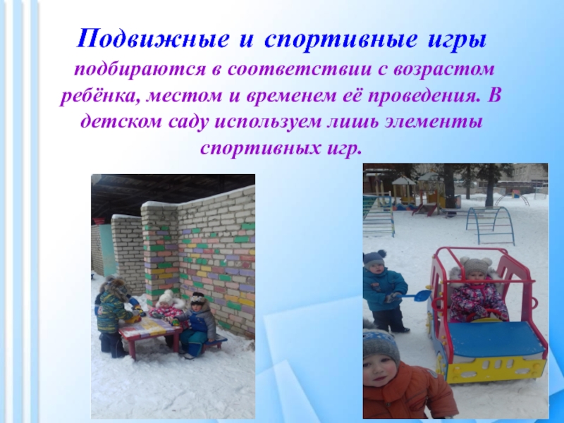 и временем её проведения. В детском саду используем лишь элементы спортивных игр.