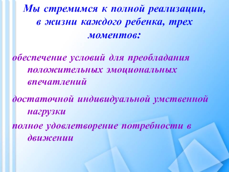 Слайд 16Мы стремимся к полной реализации, в жизни каждого ребенка, трех моментов: