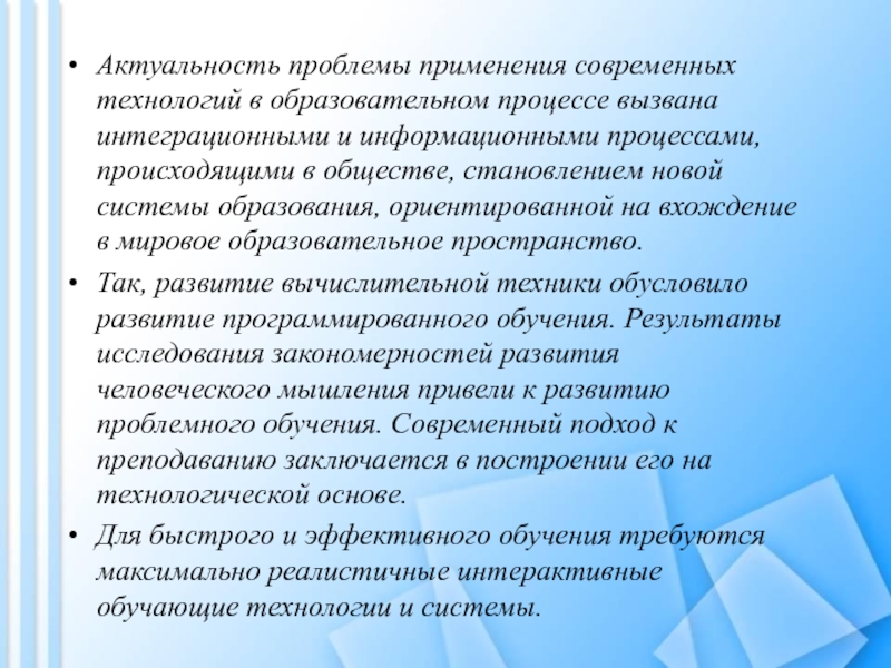 Актуальность проблемы применения современных технологий в образовательном процессе вызвана интеграционными и