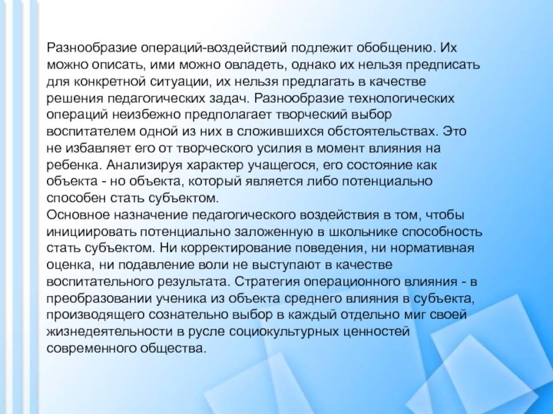 Основное назначение педагогического воздействия в том, чтобы инициировать потенциально заложенную в школьнике способность стать субъектом. Ни корректирование поведения, ни нормативная оценка, ни подавление воли не выступают в качестве воспитательного результата. Стратегия операционного влияния - в преобразовании ученика из объекта среднего влияния в субъекта, производящего сознательно выбор в каждый отдельно миг своей жизнедеятельности в русле социокультурных ценностей современного общества.