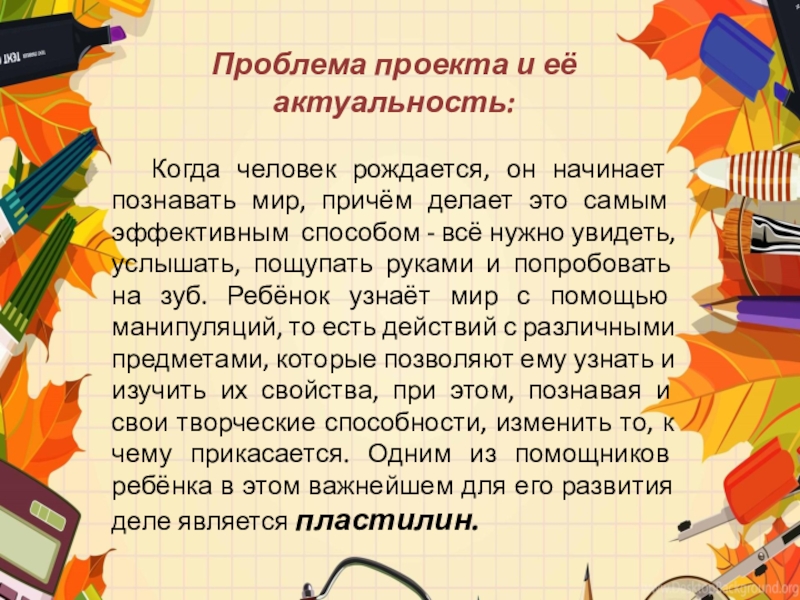 причём делает это самым эффективным способом - всё нужно увидеть, услышать, пощупать руками и попробовать на зуб. Ребёнок узнаёт мир с помощью манипуляций, то есть действий с различными предметами, которые позволяют ему узнать и изучить их свойства, при этом, познавая и свои творческие способности, изменить то, к чему прикасается. Одним из помощников ребёнка в этом важнейшем для его развития деле является пластилин.