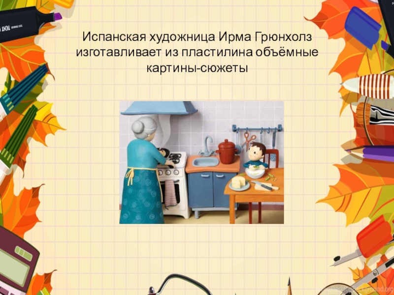 Слайд 8Испанская художница Ирма Грюнхолз изготавливает из пластилина объёмные картины-сюжеты
