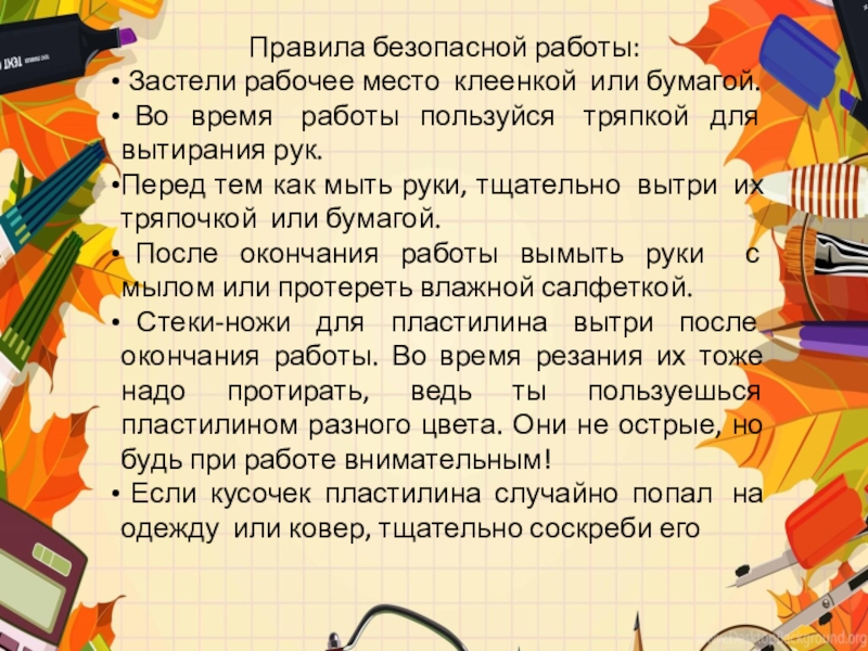 Стеки-ножи для пластилина вытри после окончания работы. Во время резания их тоже надо протирать, ведь ты пользуешься пластилином разного цвета. Они не острые, но будь при работе внимательным!