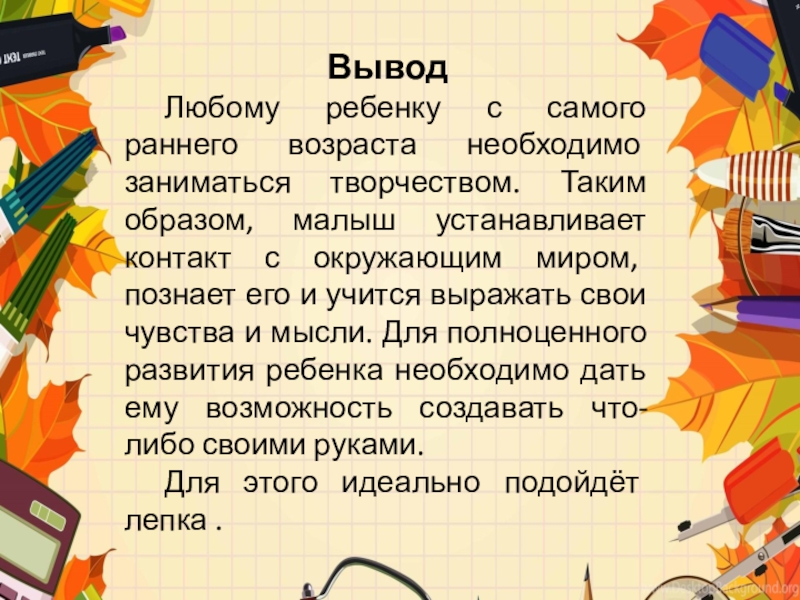 малыш устанавливает контакт с окружающим миром, познает его и учится выражать свои чувства и мысли. Для полноценного развития ребенка необходимо дать ему возможность создавать что-либо своими руками.
