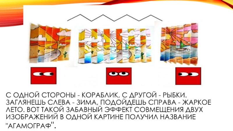 - зима, подойдешь справа - жаркое лето. Вот такой забавный эффект совмещения двух изображений в одной картине получил название "Агамограф".