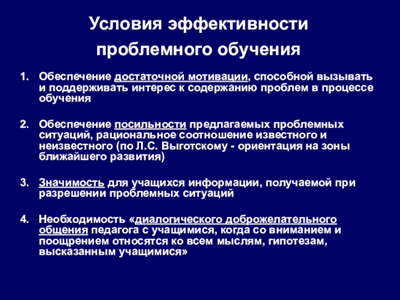 Обеспечение посильности предлагаемых проблемных ситуаций, рациональное соотношение известного и неизвестного (по Л.С. Выготскому - ориентация на зоны ближайшего развития)