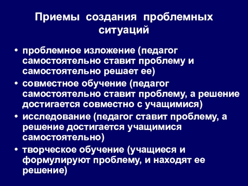 проблемное изложение (педагог самостоятельно ставит проблему и самостоятельно