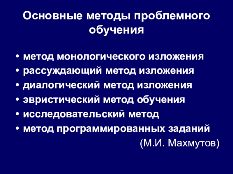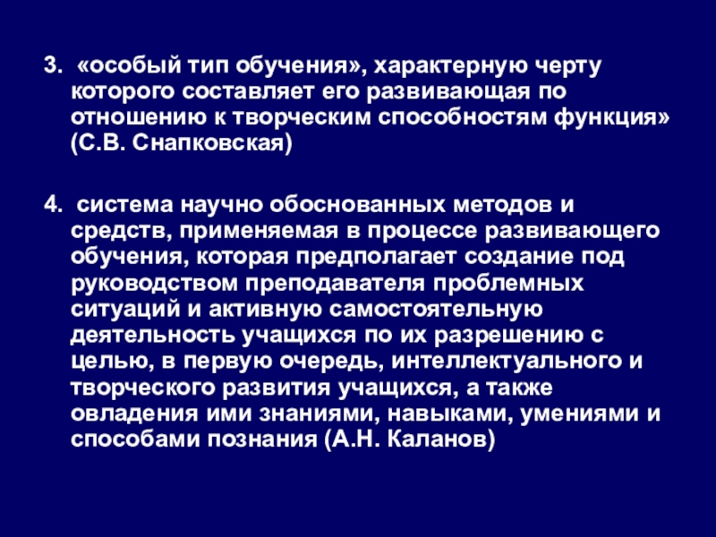4. система научно обоснованных методов и средств, применяемая в процессе развивающего обучения, которая предполагает создание под руководством преподавателя проблемных ситуаций и активную самостоятельную деятельность учащихся по их разрешению с целью, в первую очередь, интеллектуального и творческого развития учащихся, а также овладения ими знаниями, навыками, умениями и способами познания (А.Н. Каланов)