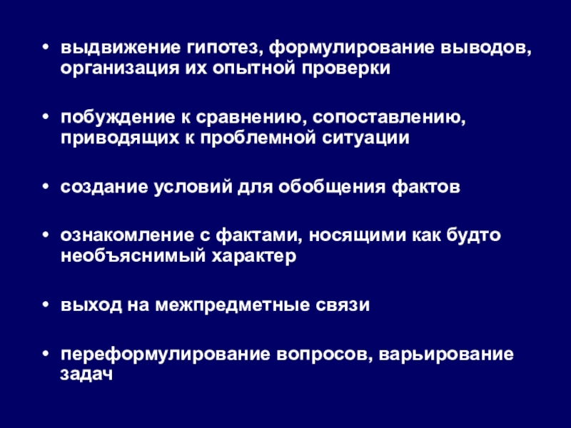 Слайд 9выдвижение гипотез, формулирование выводов, организация их опытной проверки