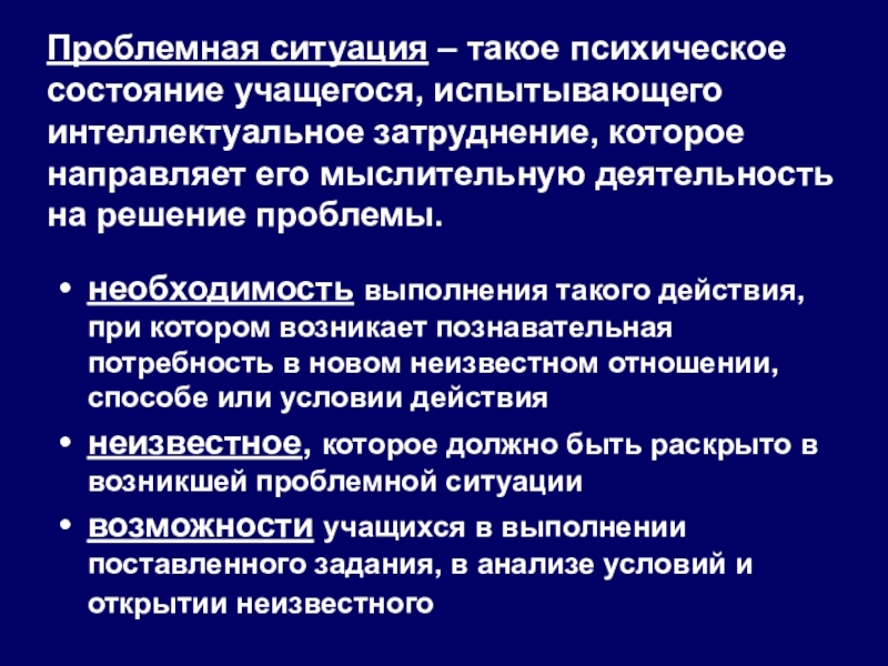 Слайд 7Проблемная ситуация – такое психическое состояние учащегося, испытывающего интеллектуальное затруднение, которое