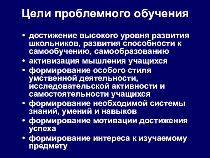 2. «тип развивающего обучения», в котором сочетаются систематическая самостоятельная поисковая деятельность учащихся с усвоением ими готовых выводов науки, а система методов построена с учетом целеполагания и принципа проблемности; процесс взаимодействия преподавания и учения ориентирован на формирование познавательной самостоятельности, устойчивости мотивов учения и мыслительных (включая и творческие) способностей в ходе усвоения научных понятий и способов деятельности, детерминированного системой проблемных ситуаций» (М.И. Махмутова)