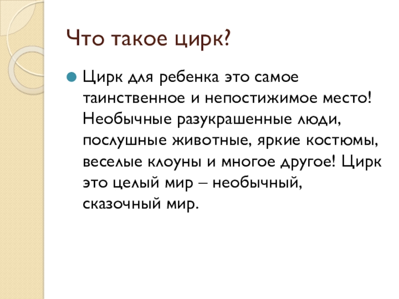 Необычные разукрашенные люди, послушные животные, яркие костюмы, веселые клоуны и многое другое! Цирк это целый мир – необычный, сказочный мир.