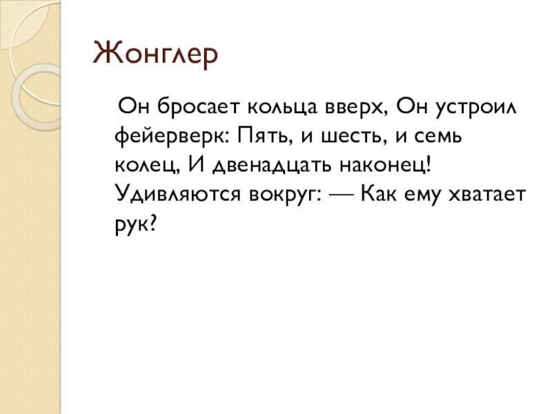 и шесть, и семь колец, И двенадцать наконец! Удивляются вокруг: — Как ему хватает рук?