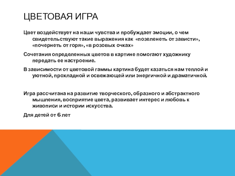Цветовая играЦвет воздействует на наши чувства и пробуждает эмоции, о чем свидетельствуют такие выражения как «позеленеть от зависти», «почернеть от горя», «в розовых очках»Сочетания определенных цветов в картине помогают художнику передать ее настроение. В зависимости от