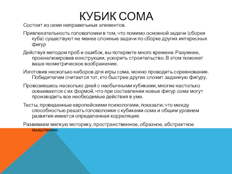 Тесты, проведенные европейскими психологами, показали, что между способностью решать головоломки с кубиками сома и общим уровнем развития имеется определенная корреляция.