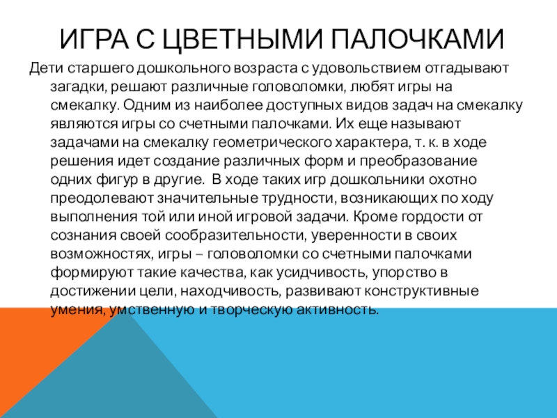 Игра с цветными палочкамиДети старшего дошкольного возраста с удовольствием отгадывают загадки, решают различные головоломки, любят игры на