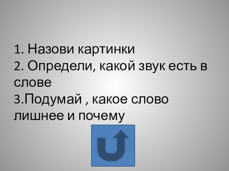 1. Назови картинки 2. Определи, какой звук есть в слове 3.Подумай , какое слово лишнее и почему
