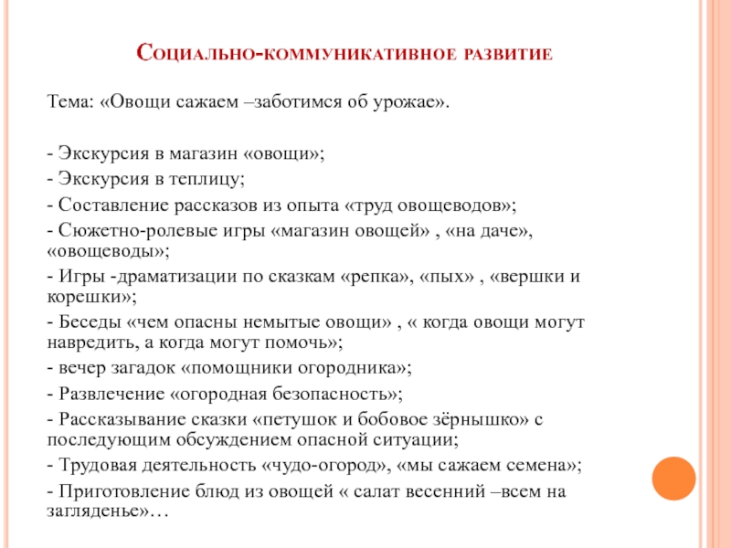 - Сюжетно-ролевые игры «магазин овощей» , «на даче», «овощеводы»;