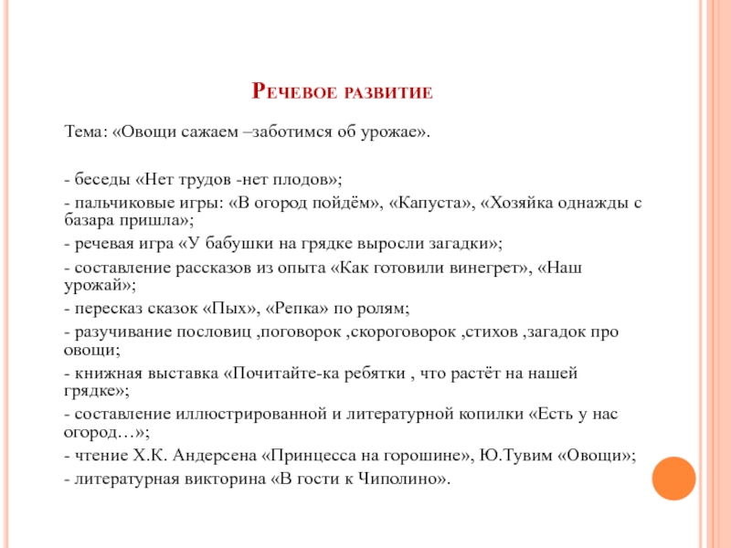 - разучивание пословиц ,поговорок ,скороговорок ,стихов ,загадок про овощи;