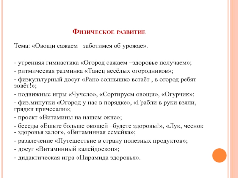 - физкультурный досуг «Рано солнышко встаёт , в огород ребят зовёт!»;