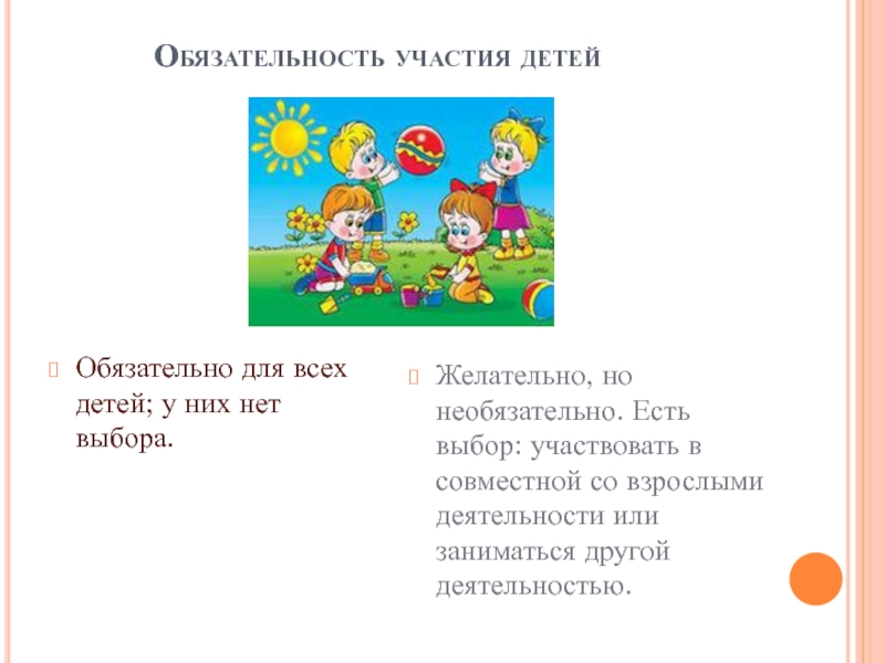 Слайд 13Обязательность участия детей