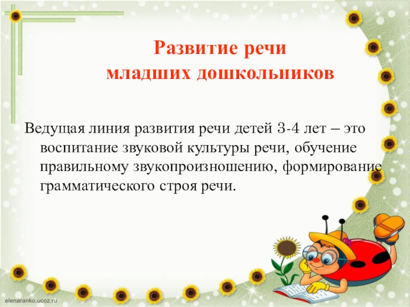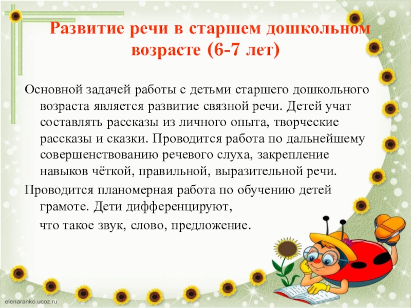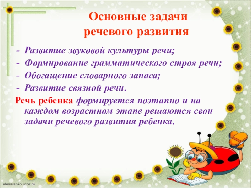 Речь ребенка формируется поэтапно и на каждом возрастном этапе решаются свои задачи речевого развития ребенка.