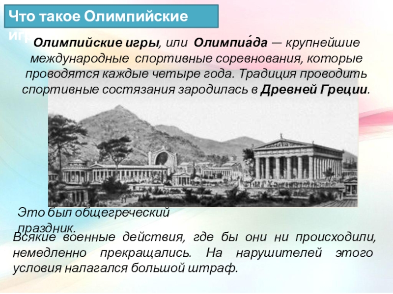 Олимпийские игры, или Олимпиа́да — крупнейшие международные спортивные соревнования, которые проводятся каждые четыре года. Традиция проводить спортивные состязания зародилась в Древней Греции.