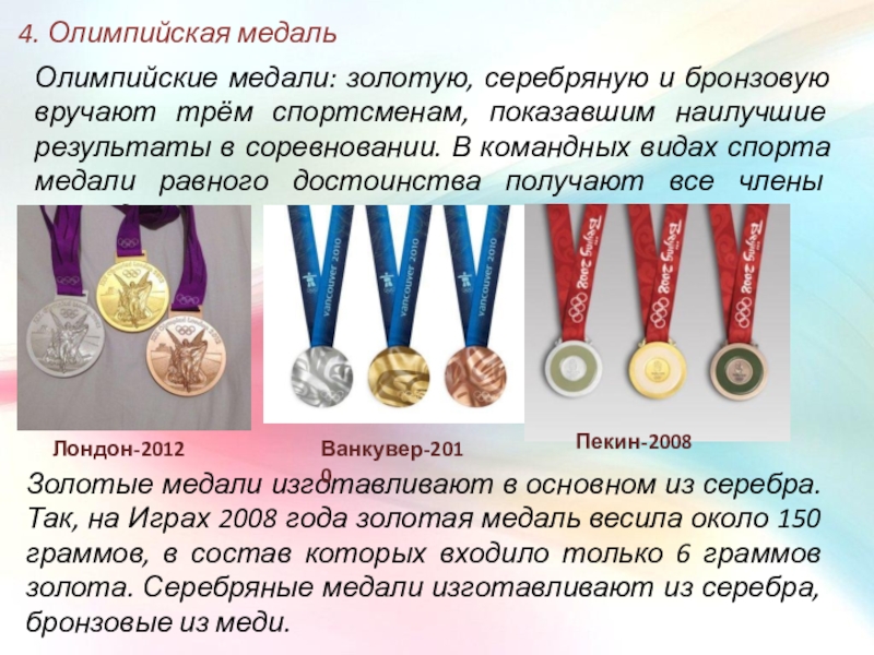 Золотые медали изготавливают в основном из серебра. Так, на Играх 2008 года золотая медаль весила около 150 граммов, в состав которых входило только 6 граммов золота. Серебряные медали изготавливают из серебра, бронзовые из меди.