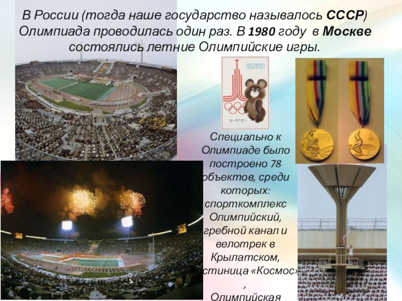 В России (тогда наше государство называлось СССР) Олимпиада проводилась один раз. В 1980 году в Москве состоялись летние Олимпийские игры.