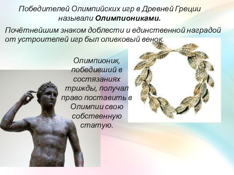 Олимпионик, победивший в состязаниях трижды, получал право поставить в Олимпии свою собственную статую.