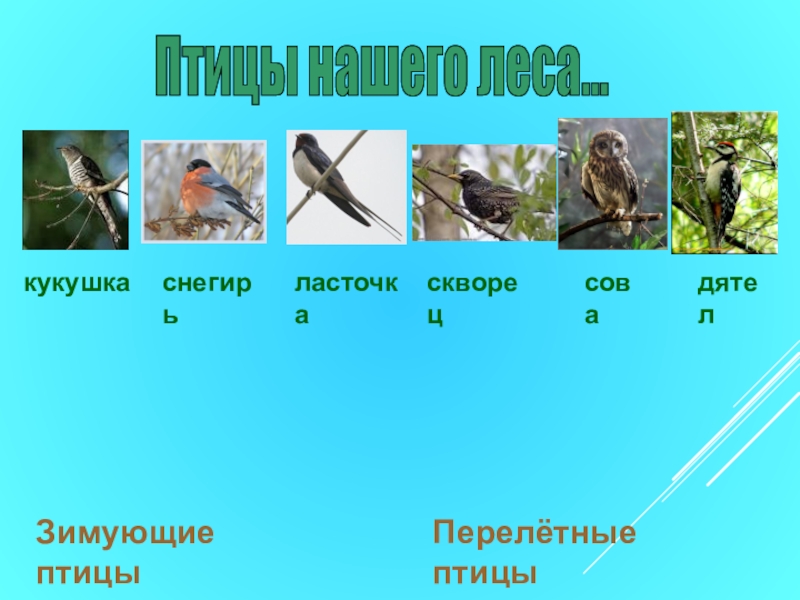 Птицы нашего леса... Зимующие птицыПерелётные птицыкукушкаснегирьласточкасоваскворецдятел