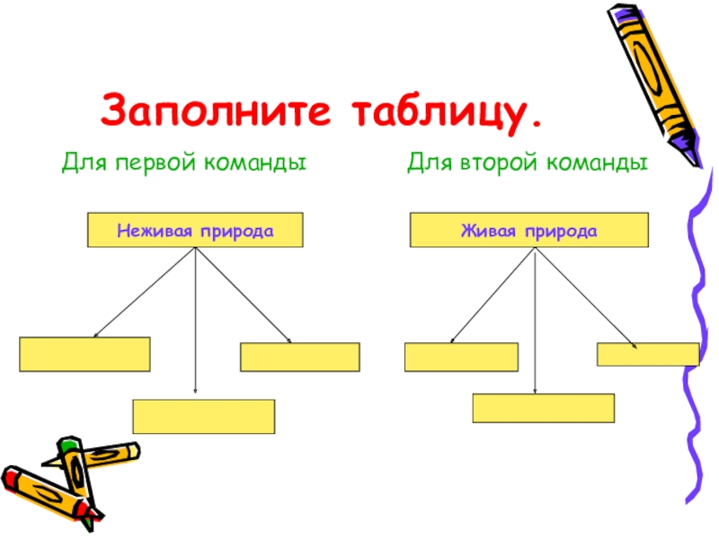 Заполните таблицу.Для первой команды       Для второй командыНеживая природаЖивая природа