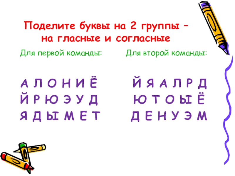 Поделите буквы на 2 группы – на гласные и согласныеДля первой команды:     Для