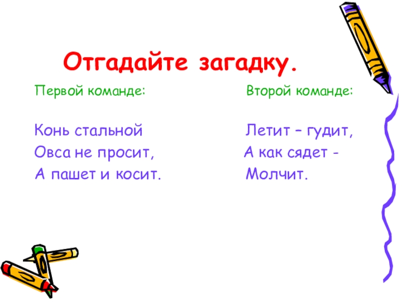 Отгадайте загадку.Первой команде:             Второй команде:Конь