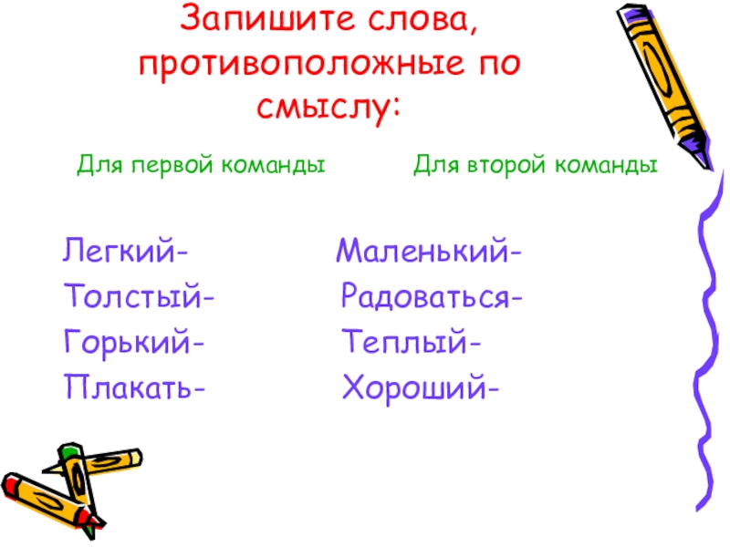 Запишите слова, противоположные по смыслу: Для первой команды      Для второй командыЛегкий-