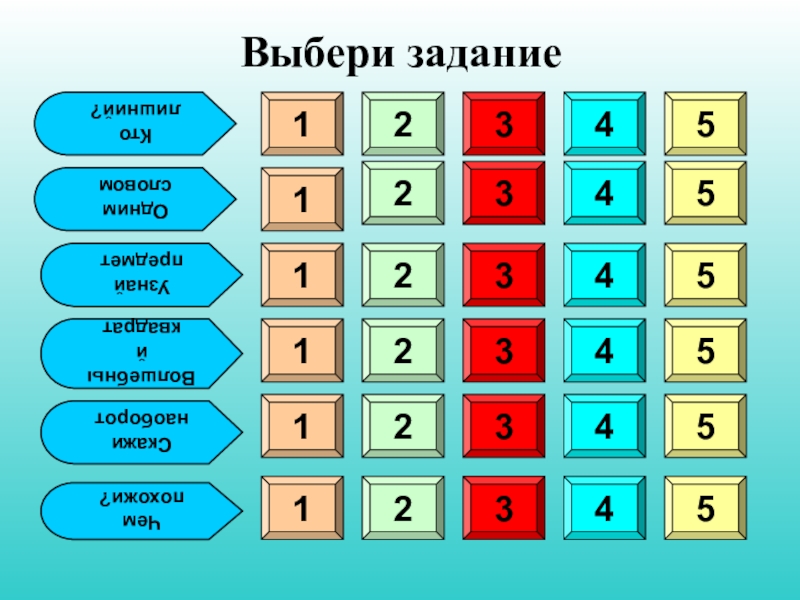Кто лишний?Одним словомУзнай предметВолшебный квадратСкажи наоборотЧем похожи?111111222222333333444444555555Выбери задание