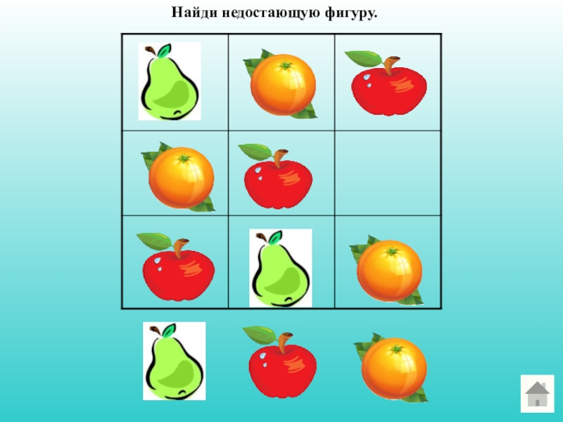 Слайд 19Найди недостающую фигуру.