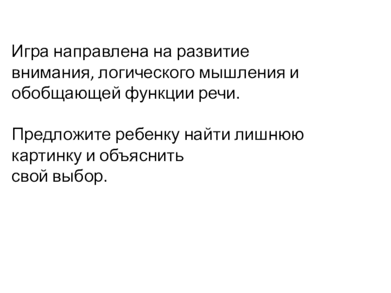 Слайд 2Игра направлена на развитие внимания, логического мышления и обобщающей функции речи.