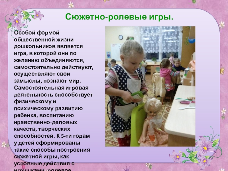 по желанию объединяются, самостоятельно действуют, осуществляют свои замыслы, познают мир. Самостоятельная игровая деятельность способствует физическому и психическому развитию ребенка, воспитанию нравственно-деловых качеств, творческих способностей. К 5-ти годам у детей сформированы такие способы построения сюжетной игры, как условные действия с игрушками, ролевое поведение.