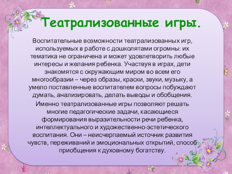 Воспитательные возможности театрализованных игр, используемых в работе с дошколятами огромны: