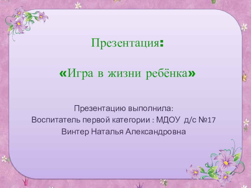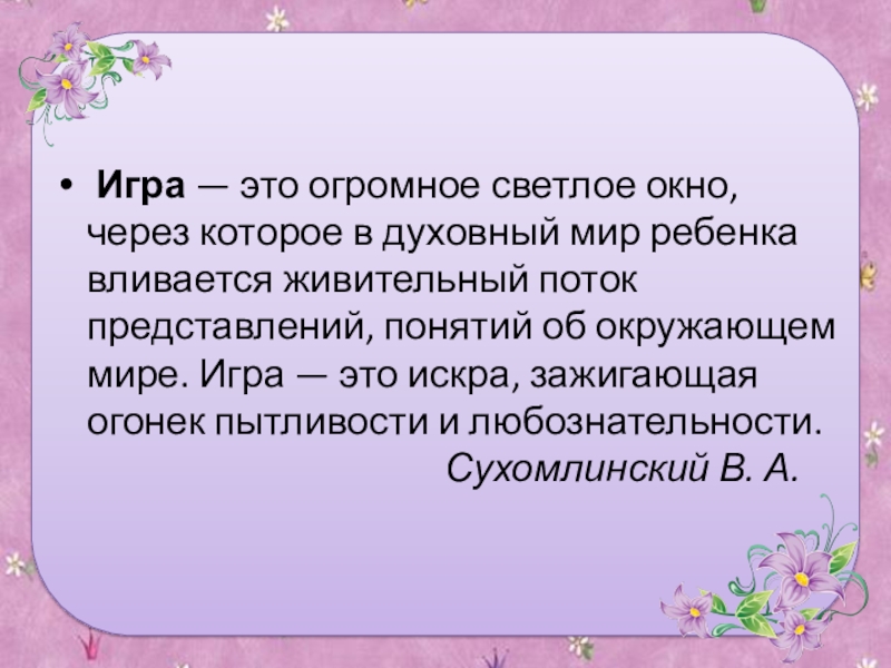 Слайд 2 Игра — это огромное светлое окно, через которое в духовный