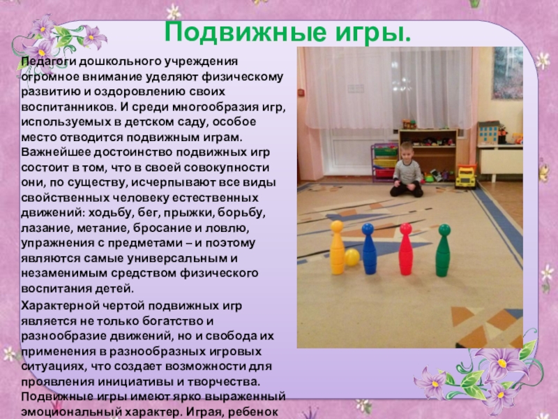 Характерной чертой подвижных игр является не только богатство и разнообразие движений, но и свобода их применения в разнообразных игровых ситуациях, что создает возможности для проявления инициативы и творчества. Подвижные игры имеют ярко выраженный эмоциональный характер. Играя, ребенок испытывает радость от напряжения физических и умственных сил, необходимых для достижения успеха.