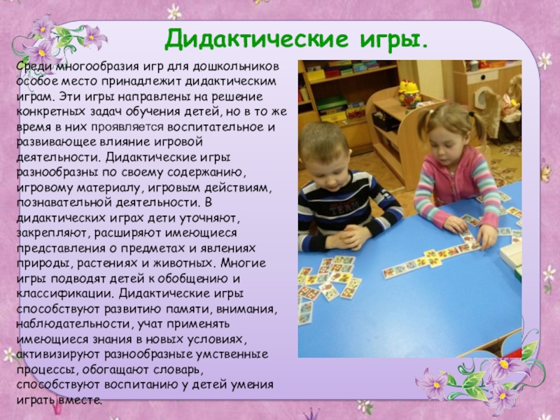 Эти игры направлены на решение конкретных задач обучения детей, но в то же время в них проявляется воспитательное и развивающее влияние игровой деятельности. Дидактические игры разнообразны по своему содержанию, игровому материалу, игровым действиям, познавательной деятельности. В дидактических играх дети уточняют, закрепляют, расширяют имеющиеся представления о предметах и явлениях природы, растениях и животных. Многие игры подводят детей к обобщению и классификации. Дидактические игры способствуют развитию памяти, внимания, наблюдательности, учат применять имеющиеся знания в новых условиях, активизируют разнообразные умственные процессы, обогащают словарь, способствуют воспитанию у детей умения играть вместе.