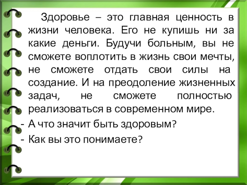 Слайд 6 Здоровье – это главная ценность в жизни человека. Его