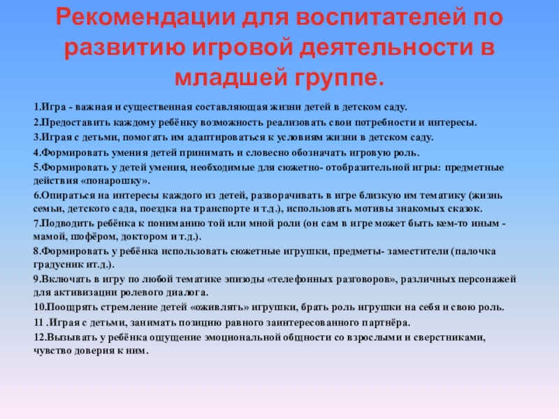 Рекомендации для воспитателей по развитию игровой деятельности в младшей группе.