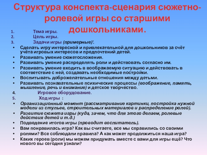 Структура конспекта-сценария сюжетно-ролевой игры со старшими дошкольниками.