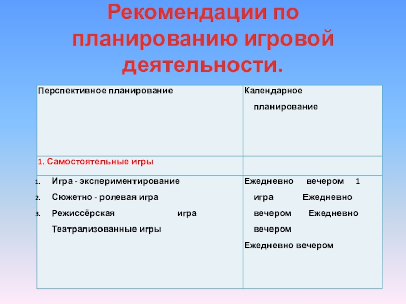 Слайд 11Рекомендации по планированию игровой деятельности.
