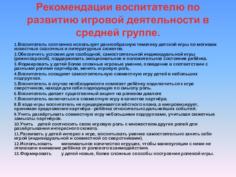 Рекомендации воспитателю по развитию игровой деятельности в средней группе.
