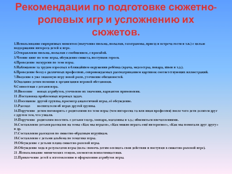 Рекомендации по подготовке сюжетно-ролевых игр и усложнению их сюжетов.